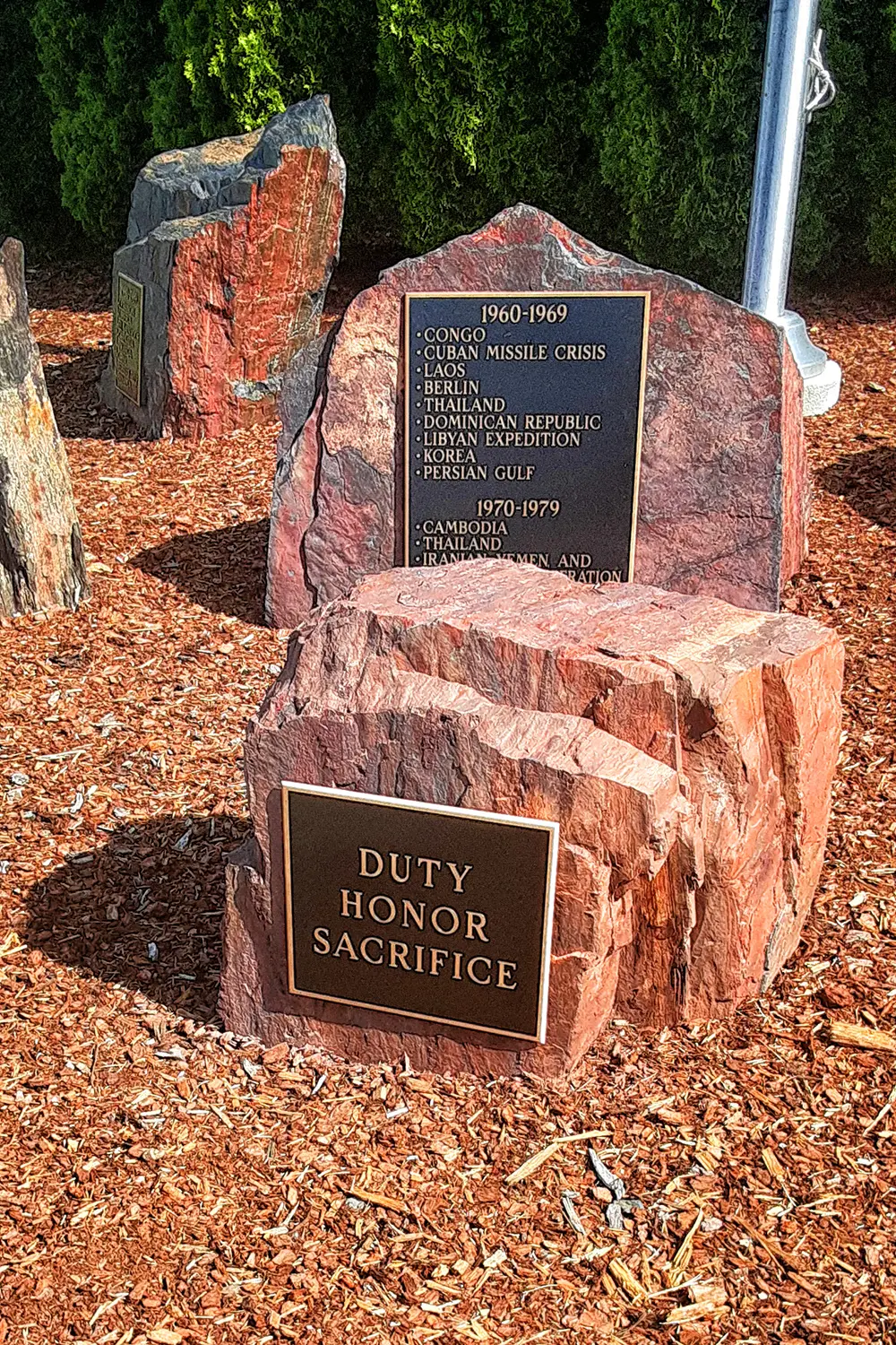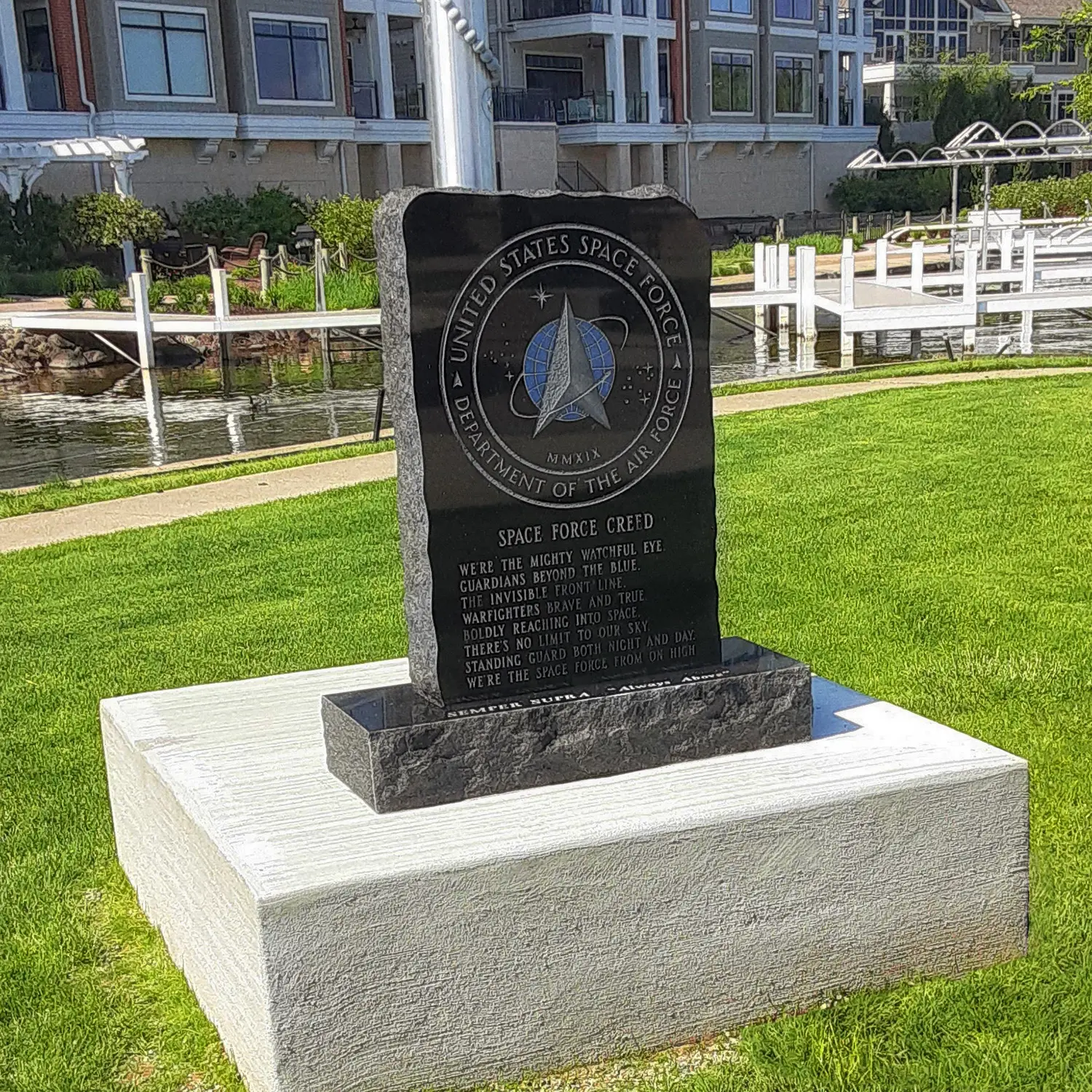 As you enter the park thru the Fort Style masonry, you’ll find the Freedom Walk which leads to the Cleary Brothers Memorial Water Fountain. To the right of the freedom walk you will visually see large Granite Rocks with Plaques and our Wisconsin Flag. These rocks represent our country’s wars and conflicts since the Vietnam War ended. The walk leads around the fountain to a small memorial garden, to the main flag pole, flying the American flag. The fountain area is shaped in a traditional five pointed star which represents the five branches of our military and flies the flags of the Army, Navy, Marines, Coast Guard, Space Force and Air Force. Space Force (becoming the 6th branch of our military) is now represented with a flag and monument just right of the Coast Guard flag. Near each point of the star stands a pentagon shaped pedestal which serves as a column designating the strength of each armed service. In front of each column, a” flying” steel arch rises above 28 feet high and connects to a compression ring which demonstrates the unity of our armed services and the unity of the country. At the top of the ring is an American Bald Eagle standing guard forever over the people who served.